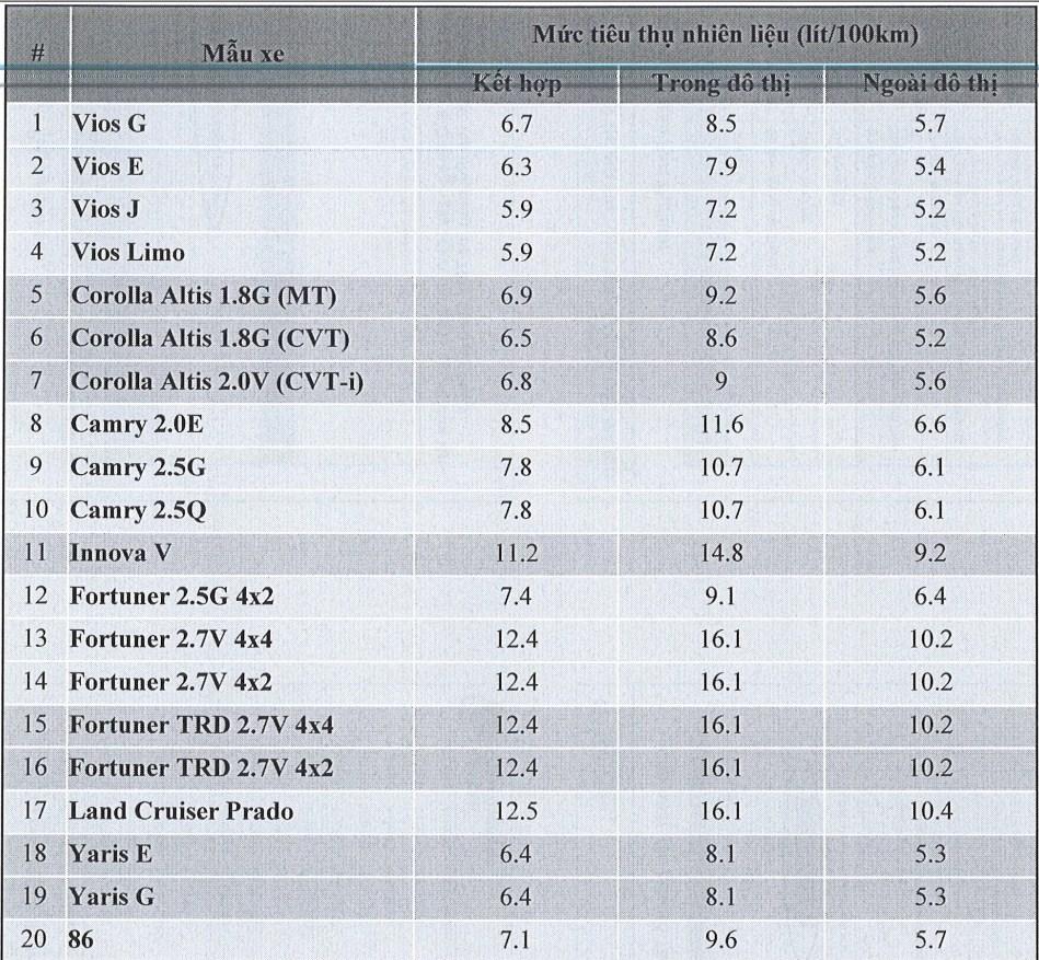 Từ ngày 1.1.2015, theo quy định của Cục đăng kiểm quốc gia Việt Nam, thông tin về mức tiêu thụ nhiên liệu phải được công bố trên các tài liệu hướng dẫn, quảng cáo giới thiệu tính năng và thông số kỹ thuật kèm theo xe và các kênh thông tin của cơ sở sản xuất lắp ráp, nhập khẩu và kinh doanh xe. Quy định này được áp dụng đối với các dòng xe có số chỗ ngồi từ 7 trở xuống. Dưới đây là bảng thông tin chính thức về mức tiêu thụ nhiên liệu của các dòng xe Toyota Việt Nam đã được Cục đăng kiểm Việt Nam thông qua: